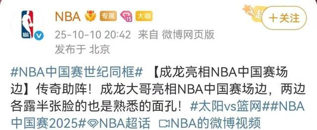 10月10日晚,NBA布鲁克林篮网队与菲尼克斯太阳队在中国澳门展开了一场季前赛较量。最终,太阳队鏖战加时以132比127击败篮网队。本场中国赛可谓是星光熠熠,成龙、姚明、贝克汉姆、奥尼尔、卡特、韦德、林书豪、梁朝伟、刘嘉玲、梁咏琪等文体明星现身场边观战。NBA官方账号发布了几段“NBA中国赛世纪同框”视频。