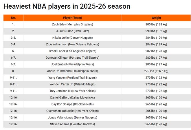 雷速体育10月12日讯 欧洲媒体BasketNews列出了当今NBA联盟球员体重榜单。在这份榜单中,灰熊的扎克·埃迪以138公斤排名联盟第一,爵士的努尔基奇132公斤紧随其后。减重后的锡安与约基奇都是129公斤,并列排名第三。快船的大洛、开拓者的克林根、76人的恩比德和德拉蒙德分列第4到第8位。中国球员杨瀚森以122公斤,并列排名联盟第9位,与他体重相同的有魔术的小卡特、尼克斯的杰米森等人。根据此前的报道,杨瀚森在刚刚被NBA选中的时候体重为118公斤。整个夏天,杨瀚森加强了力量训练,在健身房挥汗如雨,他自己也根据训练师和营养师的计划,进行了适当增重,如今体重已经达到122公斤,这对于他适应NBA的内线对抗很有帮助。