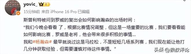 当被问到罗威的复出会如何影响杨瀚森的出场时间时斯普利特表示:“我们今晚会看看了,根据比赛情况调整,但这是一场重要的比赛,我们要看看能如何影响比赛,罗威是老将,他会带来很多积极的事情。”